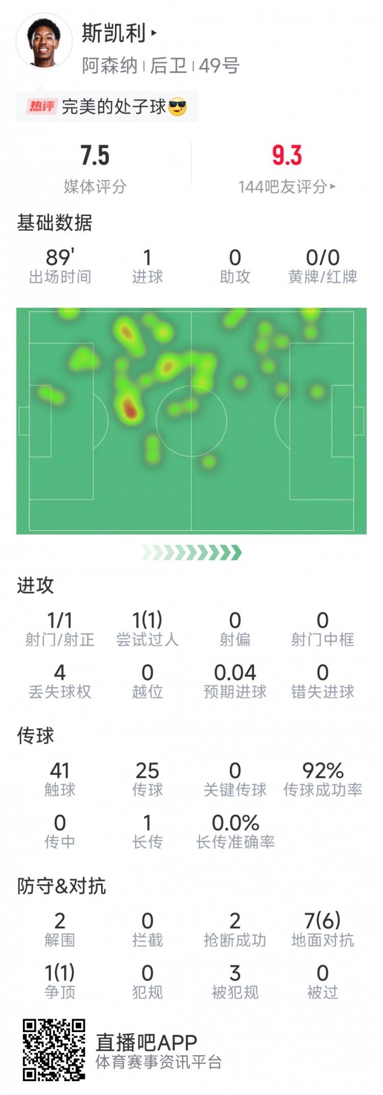 收获处子球!斯凯利本场数据:1粒进球,2抢断,8次对抗7次成功 2月3日讯 在本轮英超阿森纳对阵曼城的比赛中,小将斯凯利发挥出色,以下为他在本场数据:比赛时间89分1粒进球1次射门1次过人41次触球传球成功率92%2次解围2次抢断8次对抗7次成功sofa评分7.5 2025/02/03