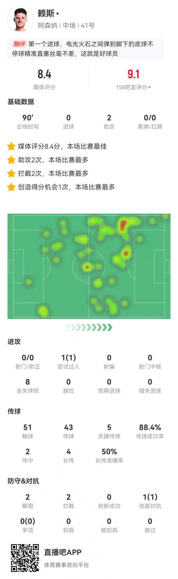 赖斯本场2助攻+5关键传球+2解围2拦截 获评8.4分全场最高 2月3日讯 阿森纳在本轮英超焦点战5-1大胜曼城,赖斯本场数据如下:首发踢满全场2助攻预期助攻0.1951触球43传球、38成功,成功率88%5关键传球2传中、0成功4长传、2成功1创造重大机会1过人 2025/02/03