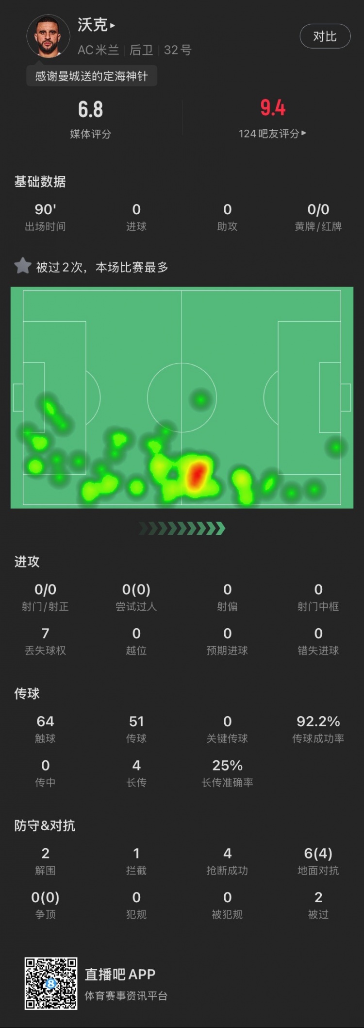 沃克米兰首秀数据:贡献2解围4抢断,6次对抗成功4次,被过2次 2月3日讯 在刚刚结束的米兰德比中,米兰1-1遭国米绝平。本场比赛,沃克迎来了自己的米兰生涯首秀,最终获评6.8分。沃克本场主要数据↓触球:64丢失球权:7传球:51传球成功率:92.2%长传:4长传 2025/02/03