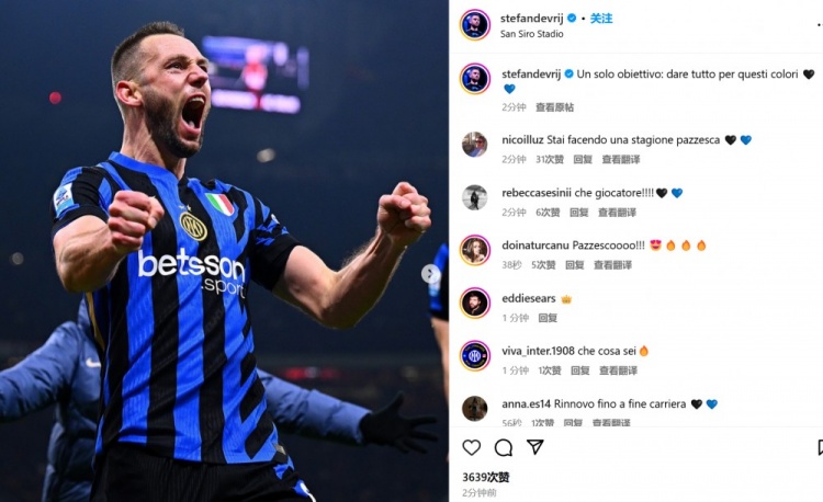 德弗里社媒晒怒吼照庆祝绝平:唯一的目标就是为国米竭尽全力 2月3日讯 国米在本轮意甲1-1绝平AC米兰,德弗里最后时刻门前建功。第93分钟,巴雷拉调整后左脚传中,扎莱夫斯基后点胸部一停,德弗里门前抽射扳平比分。德弗里也在赛后通过社媒晒出自己怒吼庆祝的照片,并 2025/02/03