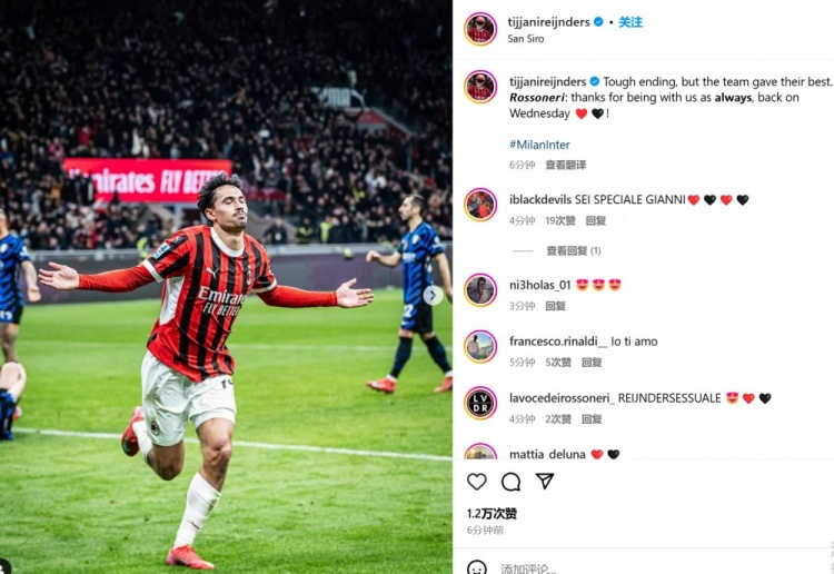 赖因德斯社媒:结局很难接受但已竭尽全力,感谢球迷们一直的支持 2月3日讯 米兰在本轮意甲1-1战平国米,赖因德斯破门、德弗里绝平。第44分钟,恰尔汗奥卢前场被断,特奥推进后送出直塞,莱奥跟进横传被挡,赖因德斯补射打破僵局。赖因德斯也在赛后晒出自己进球后的庆祝照, 2025/02/03