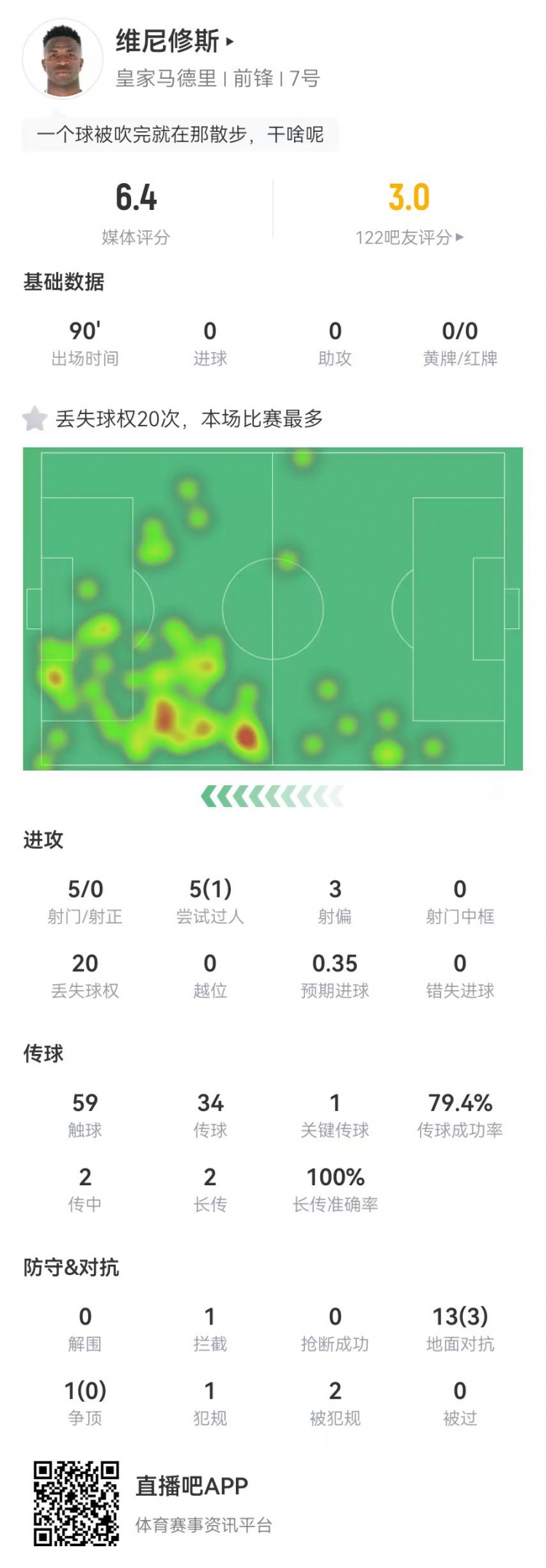维尼修斯本场5射0正 5过人1成功 14对抗3成功 6.4分全场最低 2月2日讯 皇马在本轮西甲客场不敌西班牙人,维尼修斯本场数据如下:首发踢满全场预期进球0.3559触球34传球、27成功,成功率79%1关键传球2传中、0成功2长传、2成功5射门、0射正5过人、1成功 2025/02/02