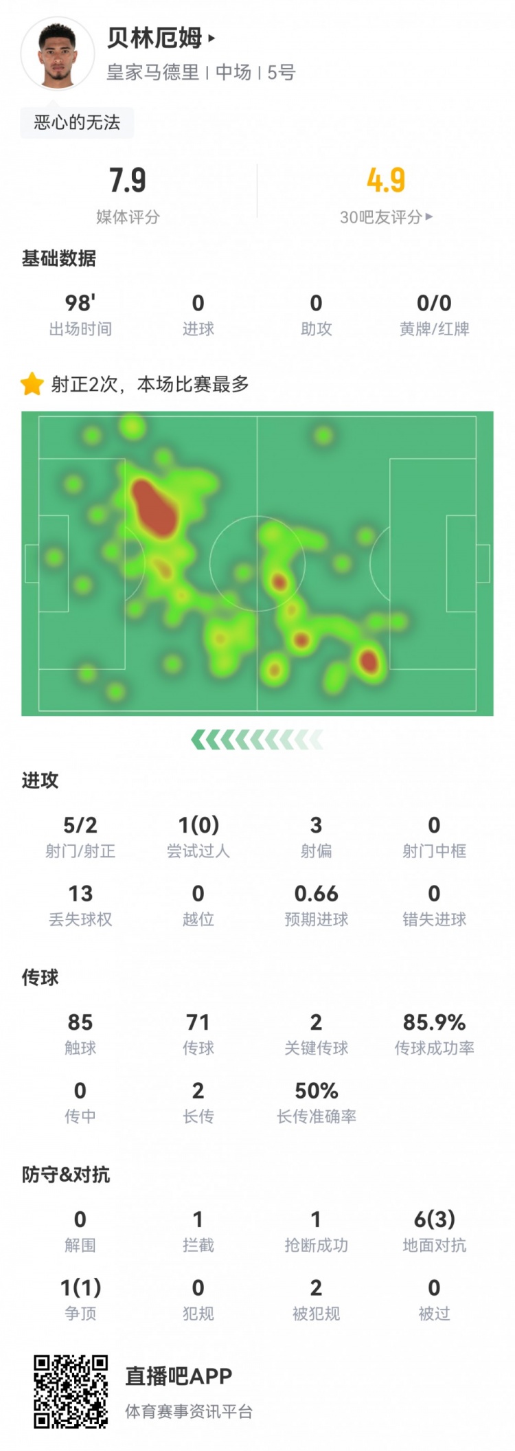 贝林厄姆本场数据:5射2正,2次关键传球,预期进球0.66,评分7.9 2月2日讯 本轮西甲,皇马0-1客负西班牙人。此役贝林厄姆首发打满全场,球员全场重点数据如下↓5射2正13次丢失球权预期进球0.6685次触球传球成功率85.9%2次关键传球7次对抗成功4次评分7.9 2025/02/02