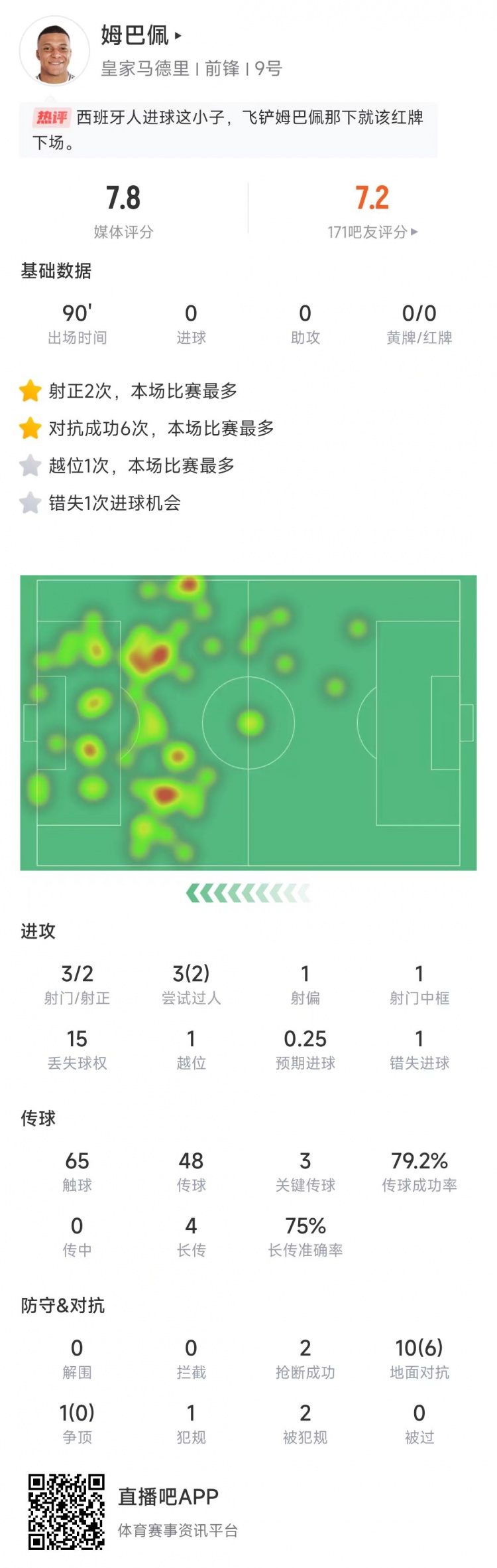 姆巴佩本场数据:3次射门2次射正,送出3记关键传球&获评7.8分 2月2日讯 西甲第22轮比赛,姆巴佩踢满全场,最终皇马客场0-1不敌西班牙人。姆巴佩本场比赛数据:出场时间——90分钟射门——3(射正2)尝试过人——3(成功2)射中门框——1丢失球权——15越位—— 2025/02/02