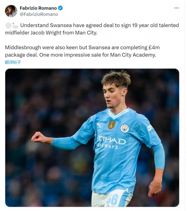 罗马诺:斯旺西引进曼城19岁中场赖特达成协议,转会费400万镑 2月1日讯 据知名记者罗马诺透露,斯旺西引进曼城19岁中场雅各布-赖特都达成协议。罗马诺指出,斯旺西和米德尔斯堡都对雅各布-赖特感兴趣,最终斯旺西在竞争中胜出,已与曼城就这位小将的转会达成协议,转会费 2025/02/01