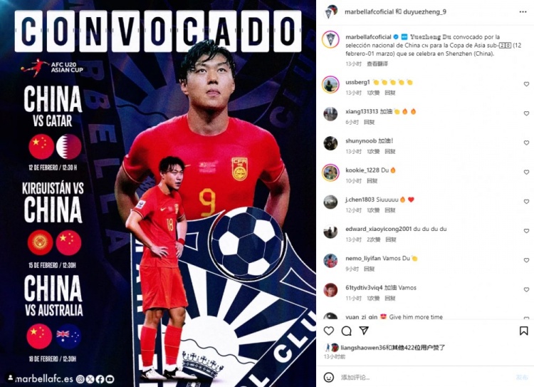 马贝拉晒杜月徴亚青赛海报,此前经协调同意提前放行球员 2月1日讯 1月30日开始,U20国足在深圳集结,备战即将到来的U20亚洲杯(亚青赛)。根据此前报道,在中国足协积极争取下,马贝拉俱乐部同意提前放行杜月徴回国备战。今日马贝拉官方社媒晒出杜月徴亚青赛海 2025/02/01